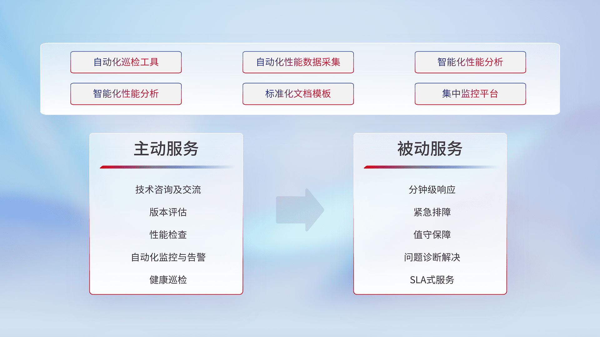 智能化工具和标准化文档,,保障服务质量,,,提供主动服务(包含技术咨询、、版本评估、、、、性能检查、、自动化监控与告警、、、健康巡检)和被动服务包含(分钟级响应、、、紧急排障、、值守保障、、、问题诊断解决、、、、SLA服务)。。
